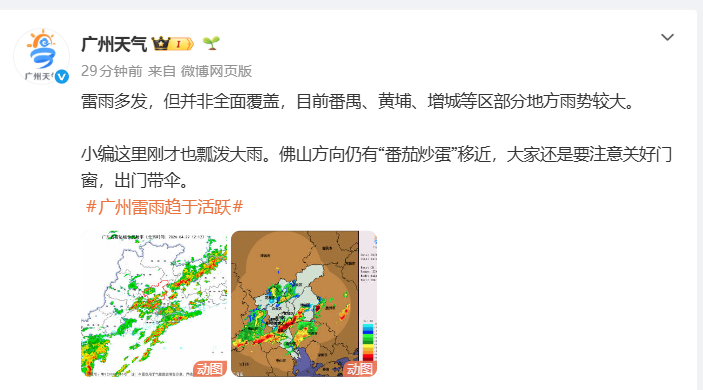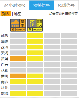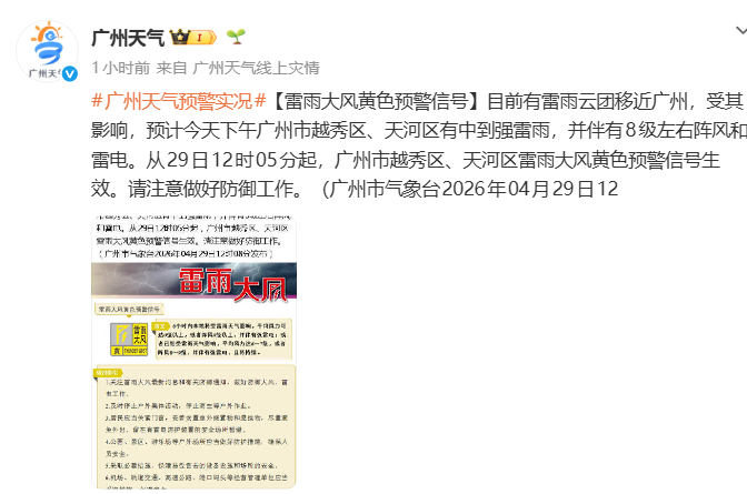 到4月29日13时22分,除白云区、花都区和从化区外,广州各区都发布了雷雨大风黄色预警信号,黄埔区和番禺区发布了暴雨橙色预警信号,南沙区和增城区发布了暴雨黄色预警信号,请注意防御。