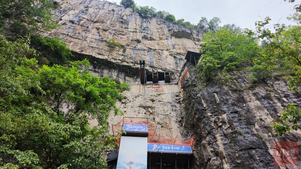小岩湾天坑内“窝囊版”蹦极运动项目。