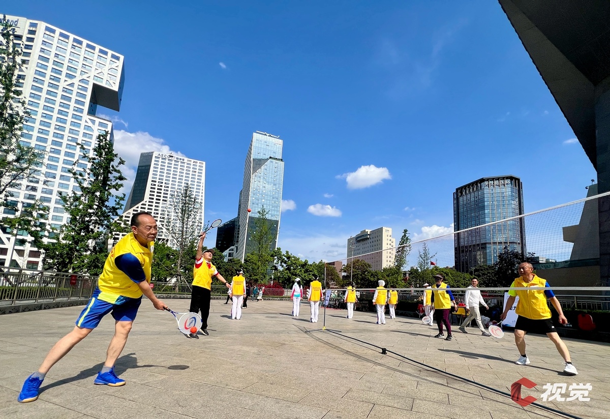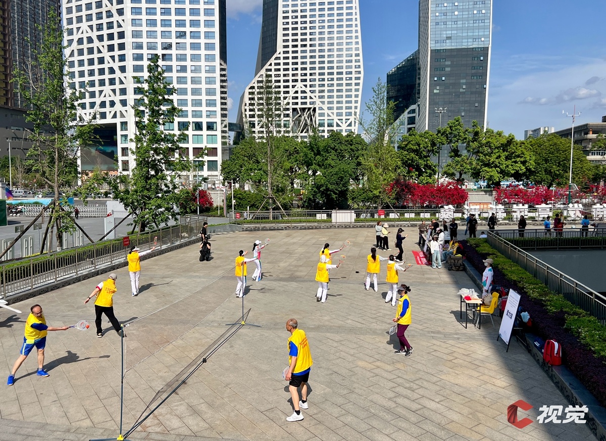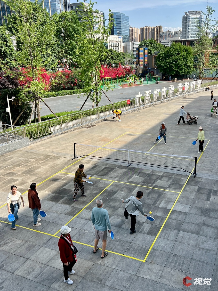 市民们在省体育馆广场上玩匹克球。