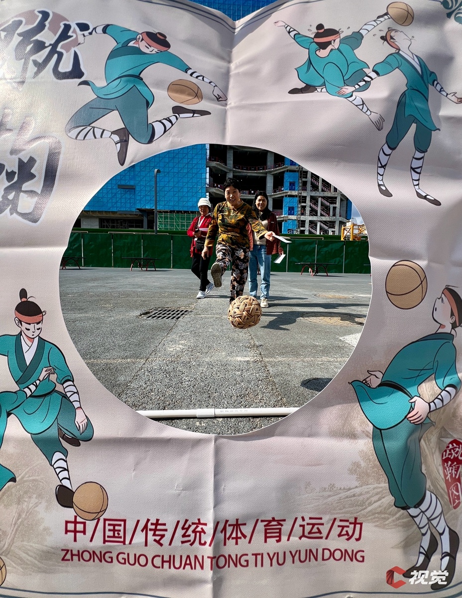市民们在省体育馆广场上体验蹴鞠运动快乐。