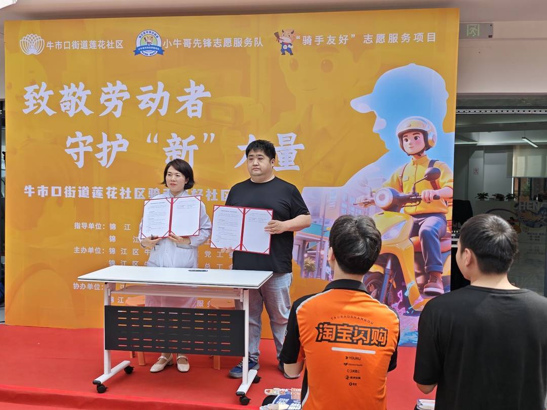 活动现场最受关注的环节是莲花社区与锦江区莲新社区卫生服务中心正式签署健康服务协议。根据协议,社区卫生服务中心每季度为注册“小牛哥”平台的骑手提供一次免费血压、血糖测量;骑手凭实名认证信息或接单记录,可享受优先挂号、优先取药、危急重症免排队等服务。随后,两名骑手代表现场签约家庭医生协议。这意味着这群常年奔波在路上的劳动者,终于有了属于自己的“健康守门人”。