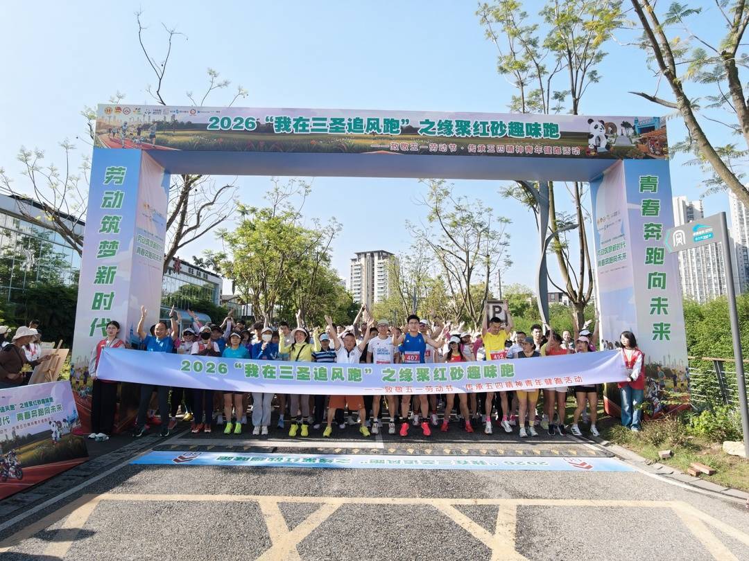 五一将至,4月29日,2026“我在三圣追风跑”青年健跑活动在成都市锦江区三圣街道红砂社区花乡农居景区举办。本次活动以“劳动筑梦新时代 青春奔跑向未来”为主题,由锦江区总工会、团锦江区委、区文化体育和旅游局、三圣街道联合主办,三圣街道总工会、红砂社区居委会承办。活动汇聚了来自锦江、蒲江、都江堰、中江四地的500余名青年与职工代表。他们用奔跑致敬劳动节,用汗水传承五四精神,在5.4公里的生态绿道赛道上展现新时代青年的蓬勃朝气。