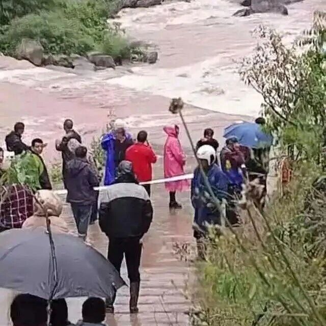 网上一段35秒视频显示,一条公路中间处地势低洼,左边的水哗哗冲向右边溪沟中,现场拉着警戒线,多位村民在现场观看,有的打着雨伞,有的背着小孩,画外音是一名女子的声音,她说“人都冲走了,三轮车也被冲走了,除了大人,三轮车里还有两个学生娃娃……家里还有个老母亲扭都扭不动(动都不能动)。”
