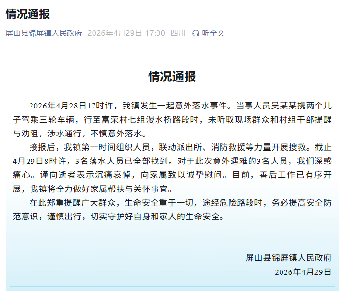 接报后,我镇第一时间组织人员,联动派出所、消防救援等力量开展搜救。截止4月29日8时许,3名落水人员已全部找到。对于此次意外遇难的3名人员,我们深感痛心。谨向逝者表示沉痛哀悼,向家属致以诚挚慰问。目前,善后工作已有序开展,我镇将全力做好家属帮扶与关怀事宜。
