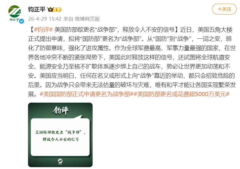 近日,美国五角大楼正式提出申请,拟将“国防部”更名为“战争部”。从“国防”到“战争”,一词之变,弱化了防御意味,强化了进攻属性。作为全球军费最高、军事力量最强的国家,在世界各地冲突不断的紧张局势下,美国此时释放这样的信号,还试图将全球航道安全、能源安全乃至核不扩散体系逐步绑上自己的战车,势必让世界更加动荡和不安。美国应当明白,任何在名义或形式上向“战争”靠近的举动,都只会招致危险的后果。因为战争只会带来无法估量的破坏与灾难,唯有和平才能让各国实现繁荣发展。