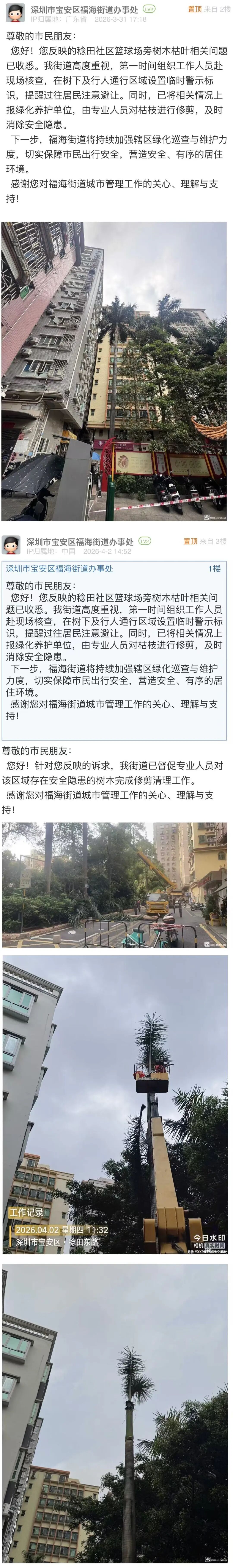 针对市民反映的树木生长过于茂盛、枯枝易坠落存在安全隐患的问题,福海街道前后两次回应,值得肯定。首次介入时,工作人员迅速到场核查,第一时间设置现场警示标识,及时消除安全隐患;二次反馈时,主动附上修剪后的现场图片,直观展示处置成效。这种“先介入、再反馈”的递进式回应,既体现了对市民诉求的高度重视,又以可视化成果增强回应说服力,为政务回应提供了可借鉴的范本。