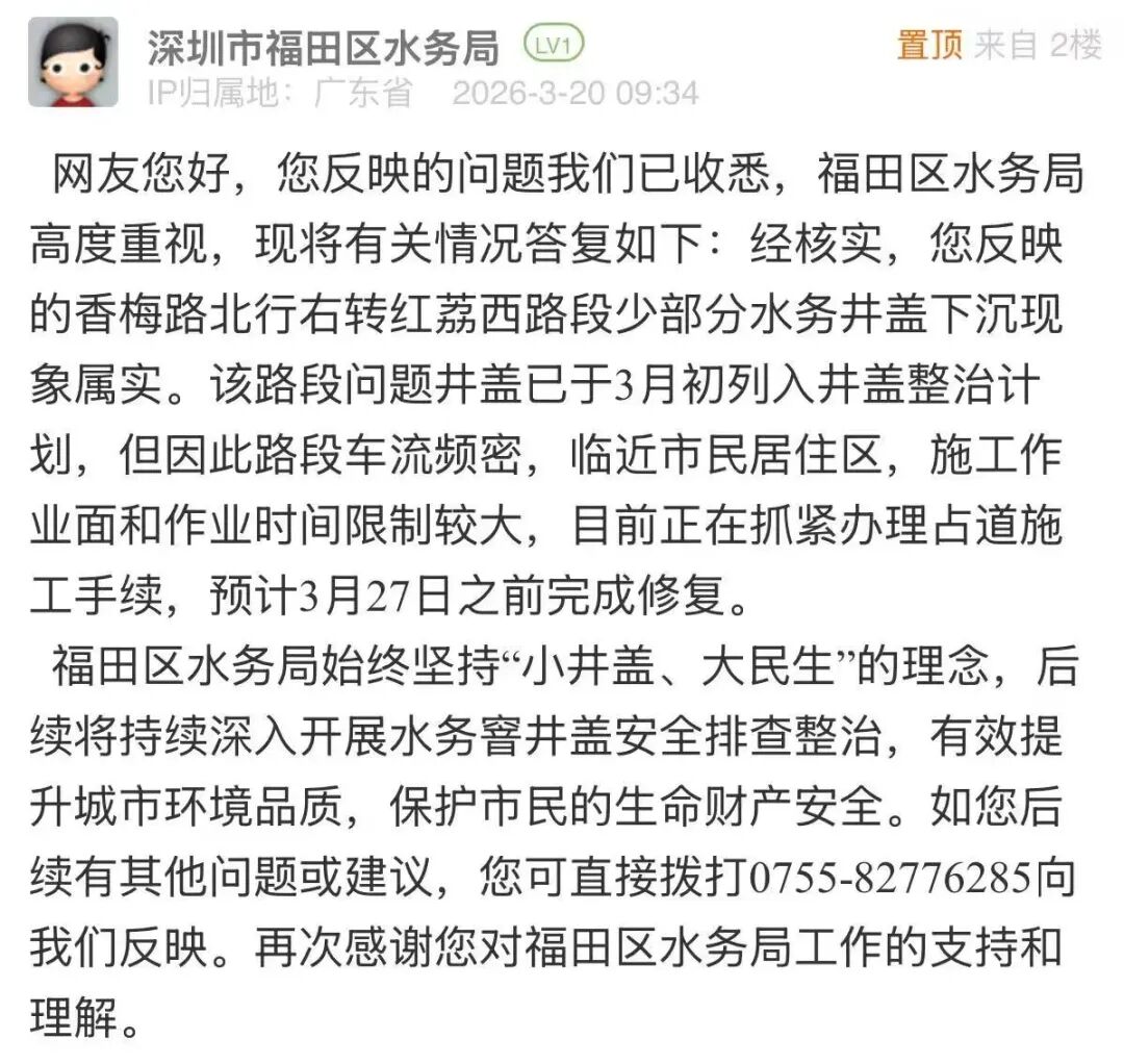 市民发帖反映存在井盖下沉的问题后,福田区水务局迅速核查,确认问题属实,第一时间回应表示该问题已列入井盖整治计划。回应在客观说明“车流大、近居民区”施工限制的同时,也给出明确修复时限,获得市民反馈积极、速度快的好评,体现了“小井盖、大民生”的治理温度,彰显了政务服务快速响应、务实担当的工作作风。