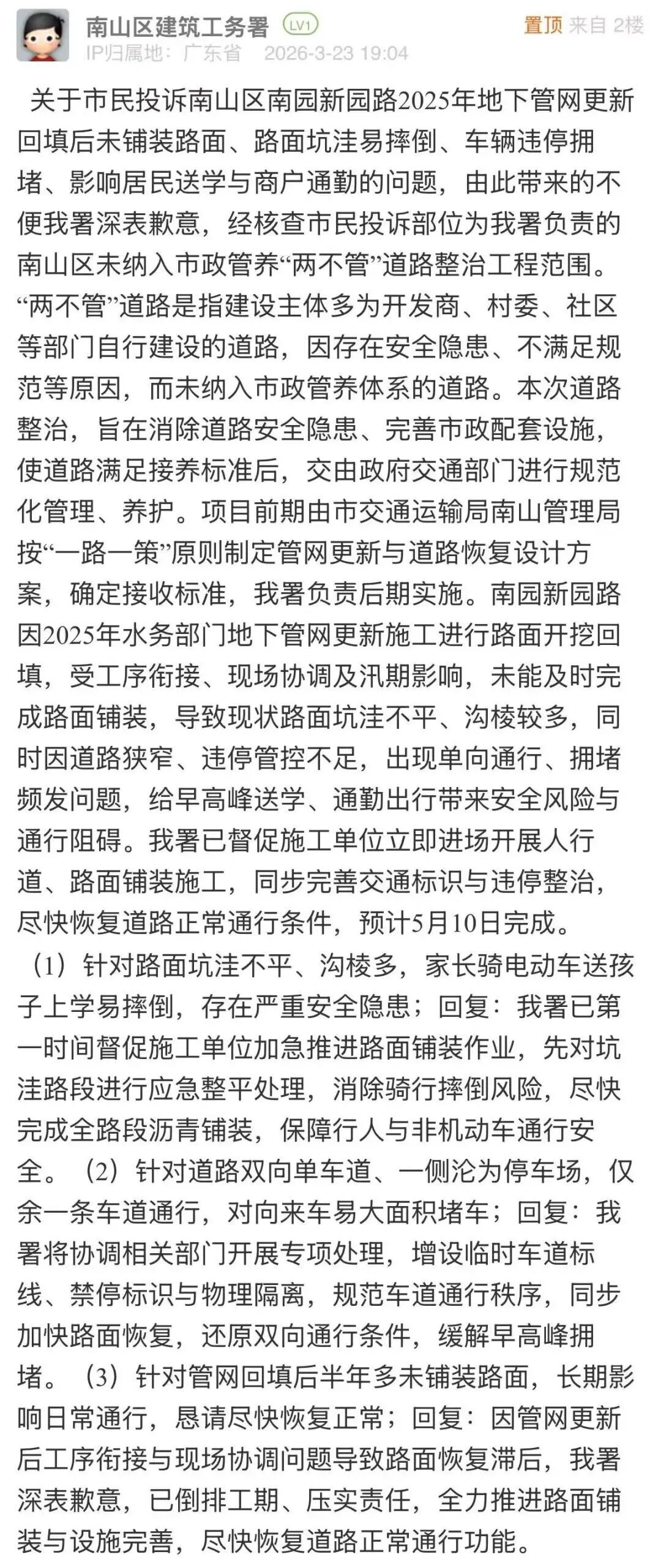 南山区建筑工务署在回应中详细介绍道路现状背景,让市民了解问题的来龙去脉,同时明确道路完善的施工安排,并给出了完成修整的预期时间。这种讲清缘由、说清计划、定清时限的回应方式,既体现了信息透明度,也给市民吃下“定心丸”,展现了该单位主动沟通、积极作为的责任担当。