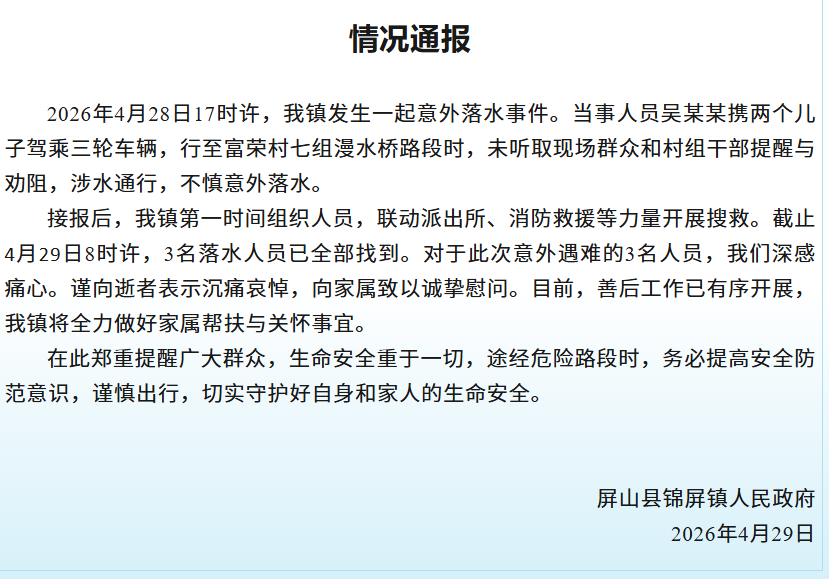 通报称,2026年4月28日17时许,当事人员吴某某携两个儿子驾乘三轮车辆,行至富荣村七组漫水桥路段时,未听取现场群众和村组干部提醒与劝阻,涉水通行,不慎意外落水。