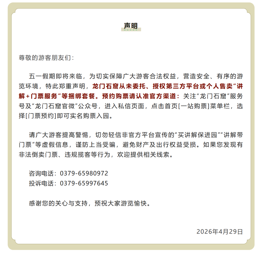 4月29日,龙门石窟景区发布声明,龙门石窟从未委托、授权第三方平台或个人售卖“讲解+门票服务”等捆绑套餐。预约购票请认准官方渠道:关注“龙门石窟”服务号及“龙门石窟官微”公众号,进入私信页面,点击首页“一站购票”菜单栏,选择“门票预约”即可实名购票入园。