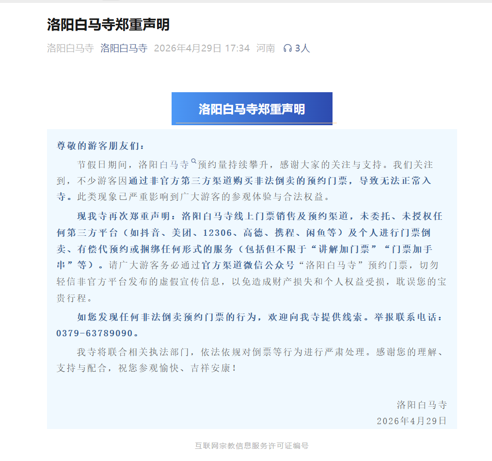 同日(4月29日),洛阳白马寺发布郑重声明: