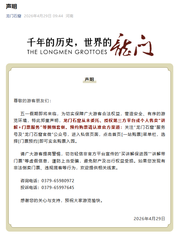 4月29日,“龙门石窟”公众号发布声明,全文如下: