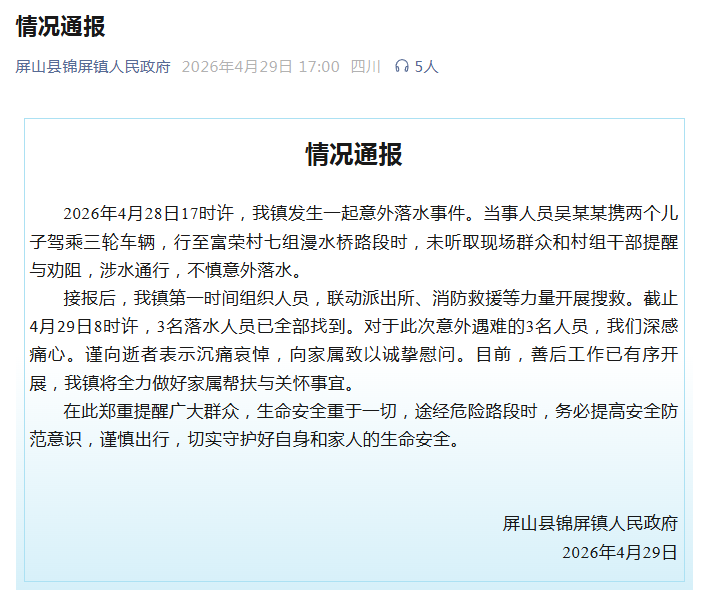 接报后,我镇第一时间组织人员,联动派出所、消防救援等力量开展搜救。截至4月29日8时许,3名落水人员已全部找到。