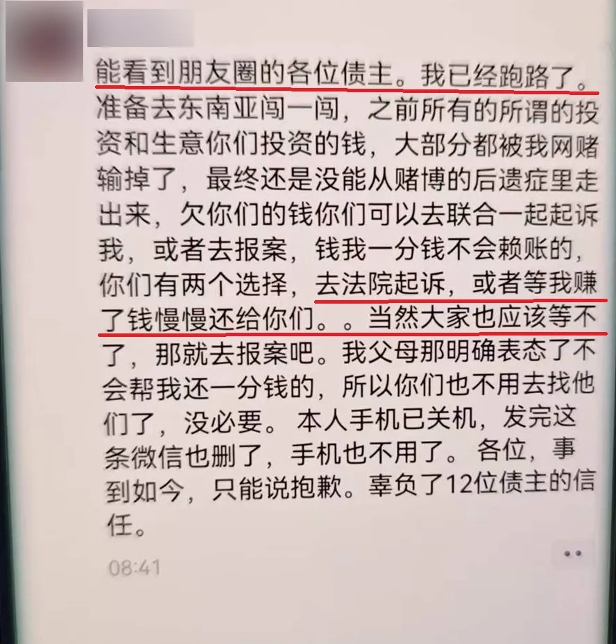“能看到朋友圈的各位债主。我已经跑路了。”无力偿还百万欠款,男子发布朋友圈声称要一走了之。