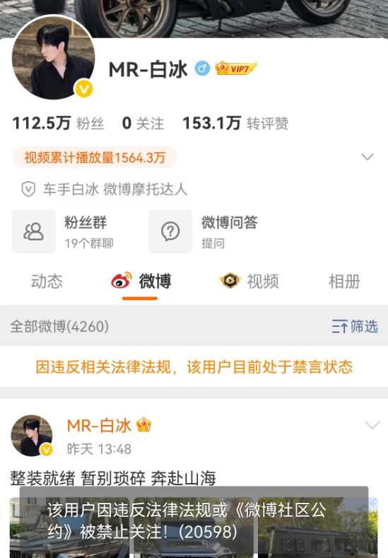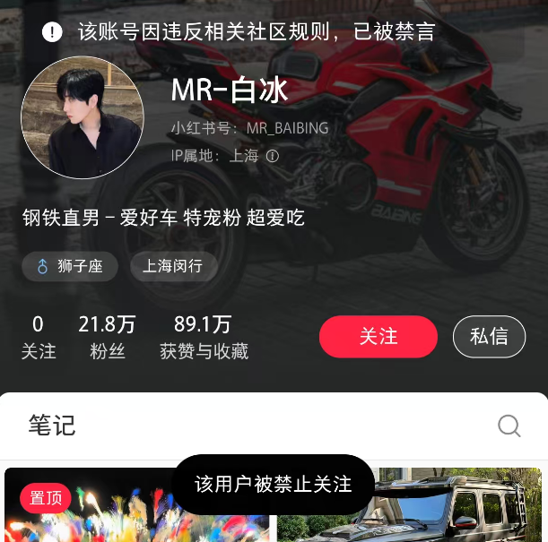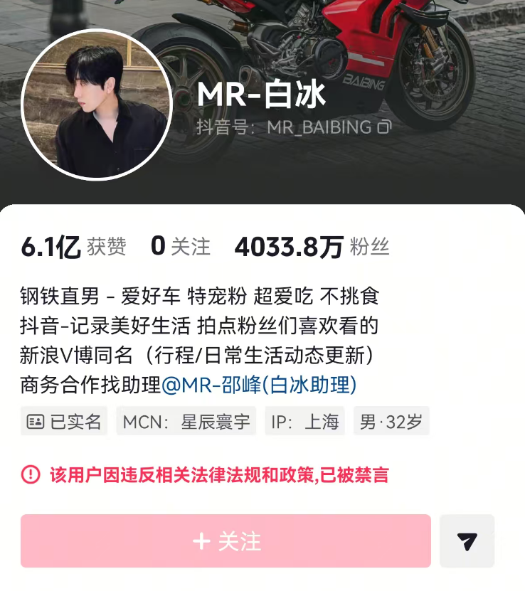 目前,白冰的小红书、微博、抖音等社交媒体平台账号均已被禁言、禁止关注。