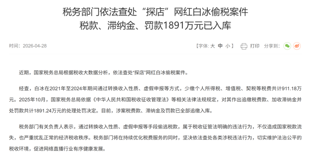 网红白冰偷税被查,追缴并罚款共计超1800万元