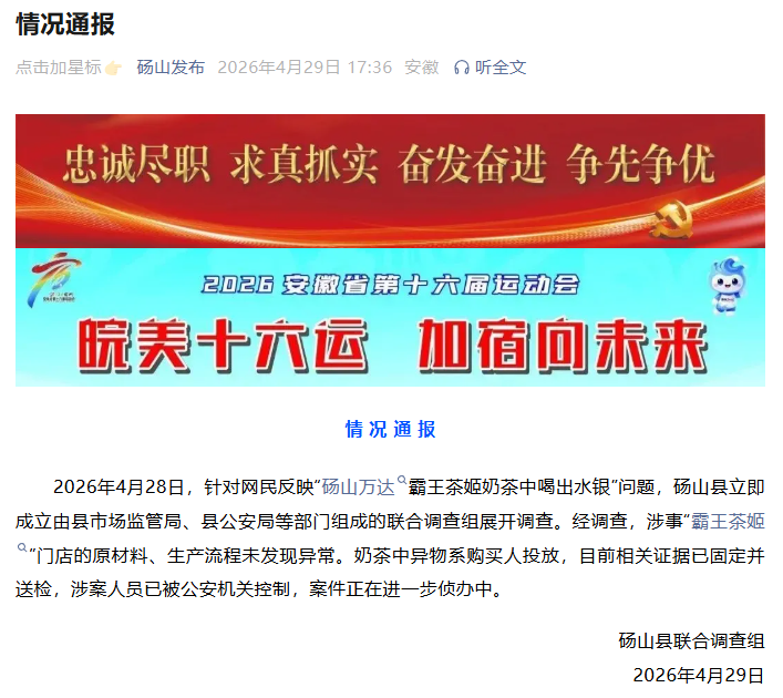 4月28日,针对网民反映“砀山万达霸王茶姬奶茶中喝出水银”问题,砀山县立即成立由县市场监管局、县公安局等部门组成的联合调查组展开调查。经调查,涉事“霸王茶姬”门店的原材料、生产流程未发现异常。奶茶中异物系购买人投放,目前相关证据已固定并送检,涉案人员已被公安机关控制,案件正在进一步侦办中。