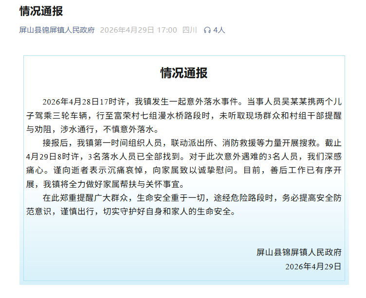 4月29日,四川屏山县锦屏镇人民政府发布情况通报,4月28日17时许,锦屏镇发生一起意外落水事件。当事人员吴某某携两个儿子驾乘三轮车辆,行至富荣村七组漫水桥路段时,未听取现场群众和村组干部提醒与劝阻,涉水通行,不慎意外落水,3名落水人员不幸遇难。