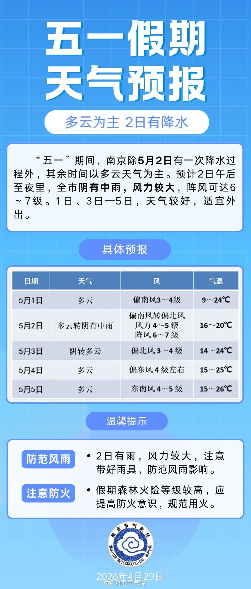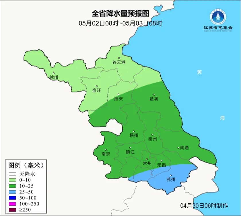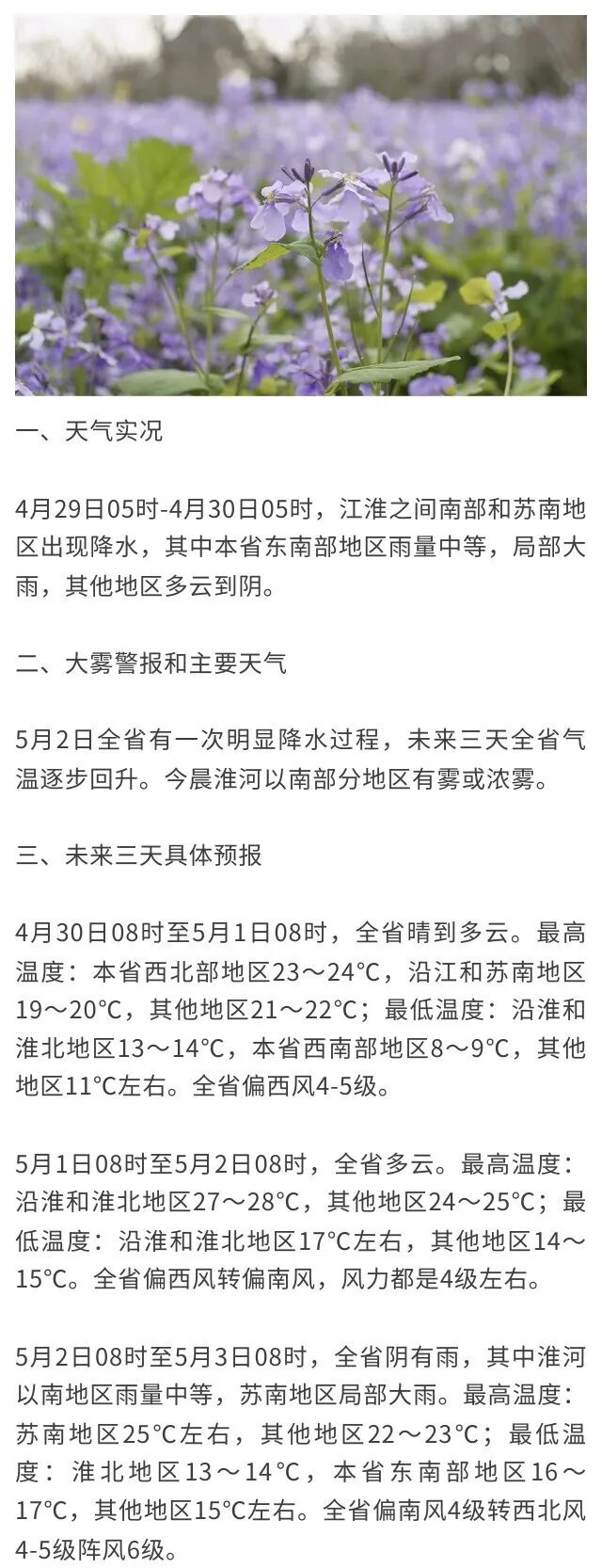 4月30日08时至5月1日08时,全省晴到多云。最高温度:本省西北部地区23~24℃,沿江和苏南地区19~20℃,其他地区21~22℃;最低温度:沿淮和淮北地区13~14℃,本省西南部地区8~9℃,其他地区11℃左右。全省偏西风4-5级。