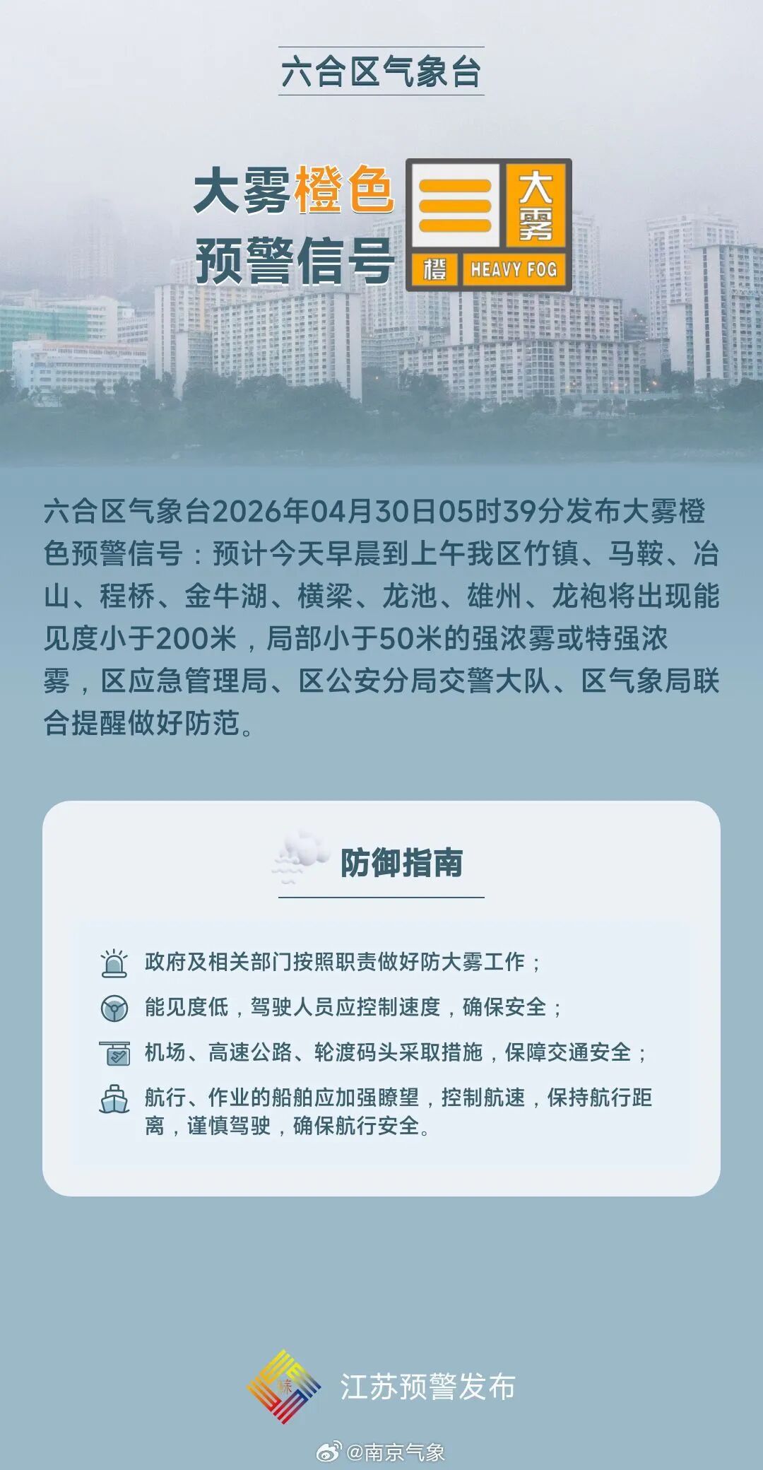 六合区气象台2026年04月30日05时39分发布大雾橙色预警信号:预计今天早晨到上午我区竹镇、马鞍、冶山、程桥、金牛湖、横梁、龙池、雄州、龙袍将出现能见度小于200米,局部小于50米的强浓雾或特强浓雾。