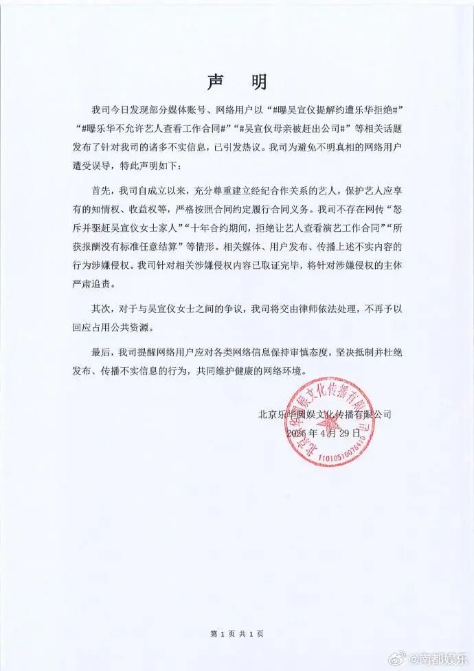 声明中称“曝吴宣仪提解约遭乐华拒绝、曝乐华不允许艺人查看工作合同、吴宣仪母亲被赶出公司”等相关话题为不实信息,不存在网传“怒斥并驱赶吴宣仪女士家人”“十年合约期间,拒绝让艺人查看演艺工作合同”“所获报酬没有标准任意结算”等情形,已针对相关涉嫌侵权内容已取证完毕,将针对涉嫌侵权的主体严肃追责。
