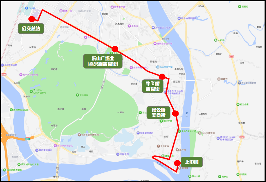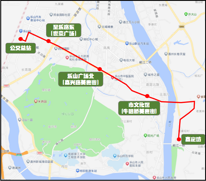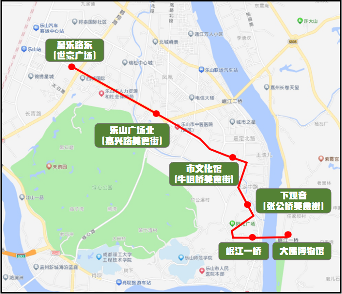 (2)停靠站点:公交总站—乐山广场北(嘉兴路美食街)—牛咡桥美食街—张公桥美食街—上中顺