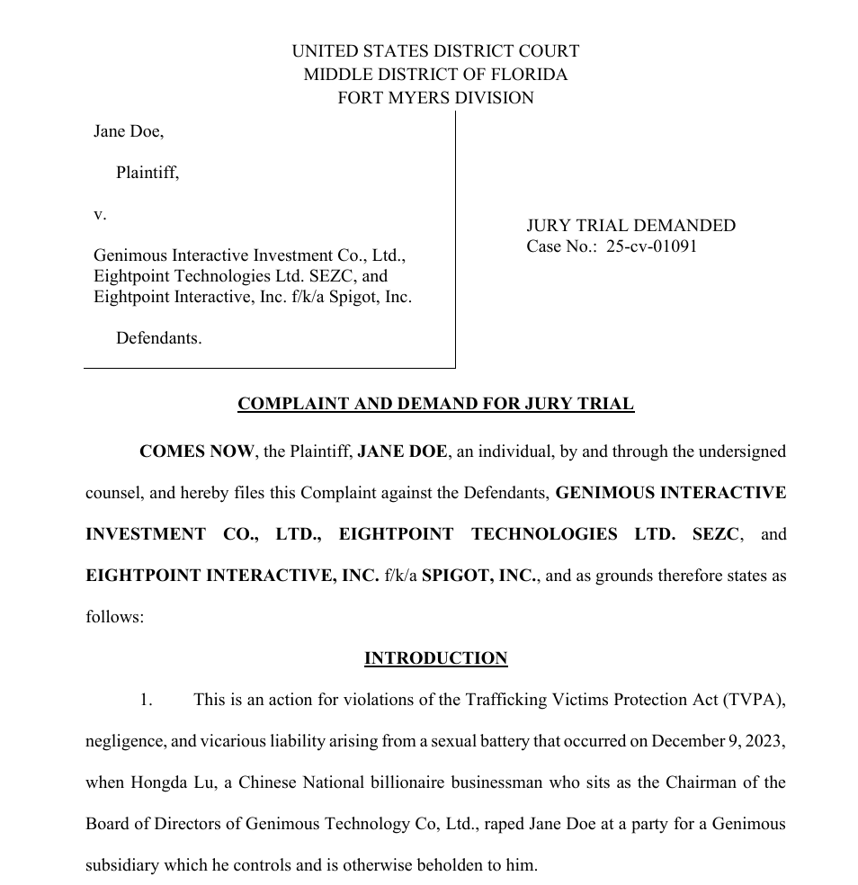 Genimous Technology Co., Ltd.即智度股份英文名称。据报道,上述原告方还向Genimous Interactive Investment Co., Ltd.、Eightpoint Technologies Ltd. SEZC和Eightpoint Interactive, Inc.三家公司提出承担过失责任和替代责任的诉讼请求,不过上述请求因不属于管辖范围而遭佛罗里达州中区地方法院迈尔斯堡分院暂时驳回。