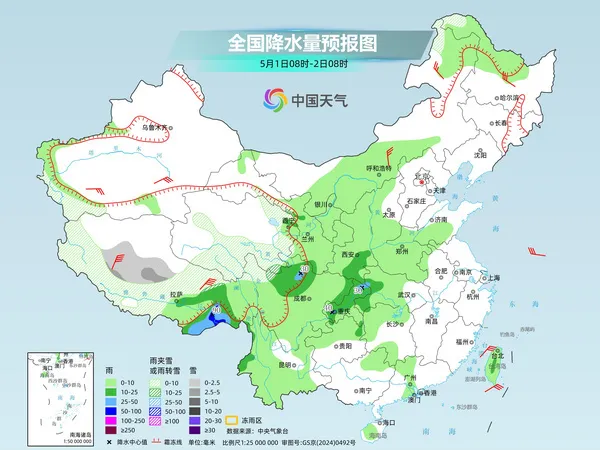 据中国天气网报道,明天,五一假期将开启,新一轮降水又将发展起来,青藏高原、西北地区东部、华北大部、黄淮南部及南方地区自西向东将有大范围降水过程,其中江南、华南中北部等地有大到暴雨,局地大暴雨,部分地区伴有雷暴大风、短时强降水等强对流天气,强降雨时段主要在5月2日至3日。
