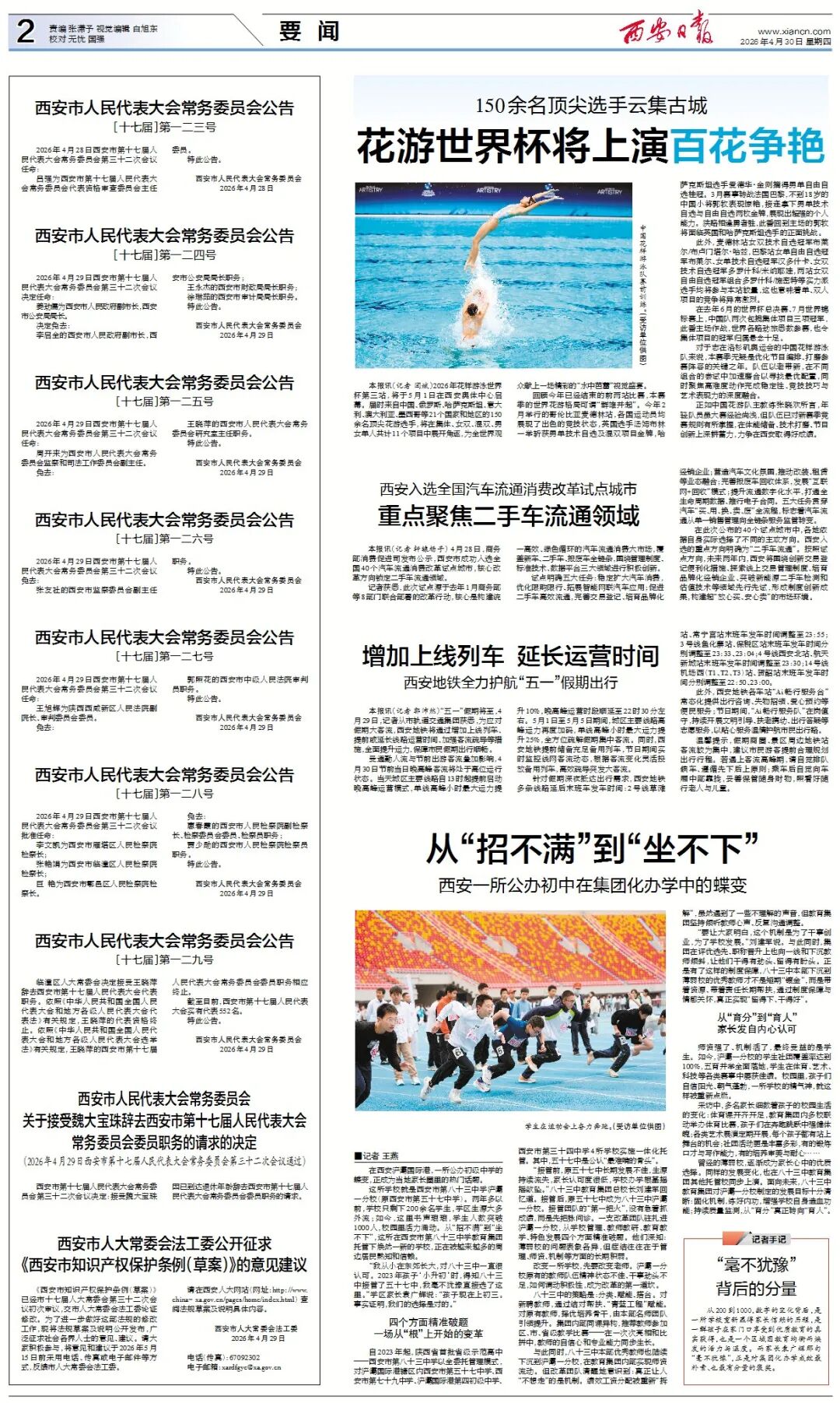 2026年花样游泳世界杯第三站,将于5月1日在西安奥体中心启幕。届时来自中国、俄罗斯、哈萨克斯坦、意大利、澳大利亚、墨西哥等21个国家和地区的150余名顶尖花游选手,将在集体、女双、混双、男女单人共计11个项目中展开角逐,为全世界观众献上一场精彩的“水中芭蕾”视觉盛宴。图为中国花样游泳队赛前训练。(受访单位供图)