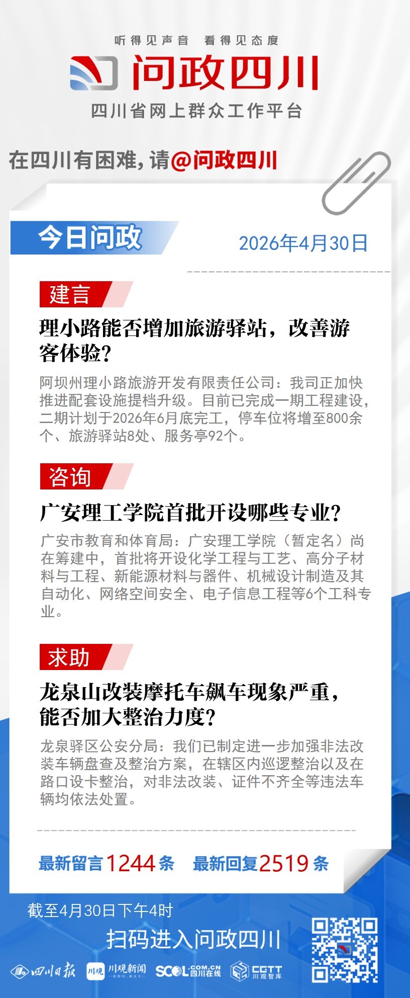 在四川有困难,找问政四川。如果您在四川遇到了操心事、烦心事、揪心事,请登录“四川省网上群众工作平台—问政四川”或拨打问政四川热线(028-96001)留言反映、求助或建议。我们将充分发挥平台的互动联系作用及舆论监督功能,第一时间传递民声,推动问题得以及时解决——听得见声音,看得见态度。