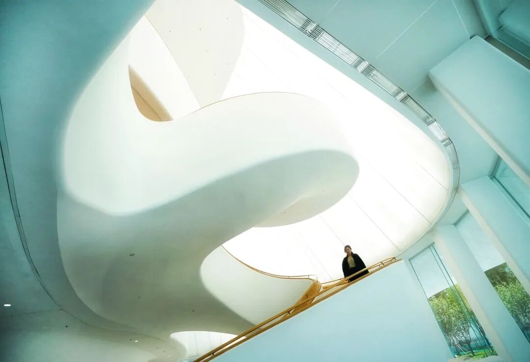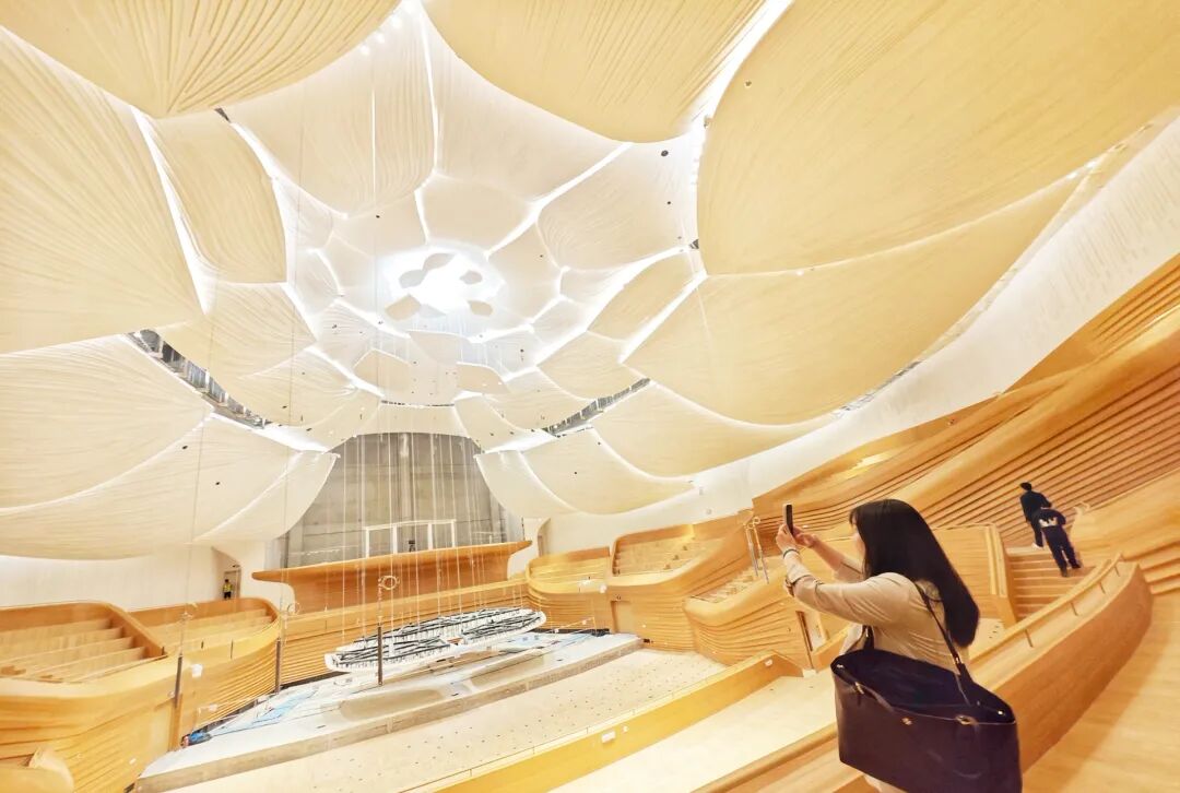 移步大音乐厅,眼前的建筑美学令人惊叹。天花板由56块莲花瓣造型的反声板组成,简洁高雅;中央的舞台可容纳120名演奏员及管风琴设施;四周则是梯田葡萄园式的座席,可供1600人观赏演出。头顶的每一片大花瓣,都由很多小花瓣组成,尺寸、高度不同,构件也都是曲面、异形的,总共有上万个吊点,这对施工的精度、顺序提出了很高要求。