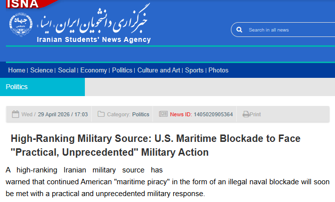 伊朗学生通讯社29日相关报道截图