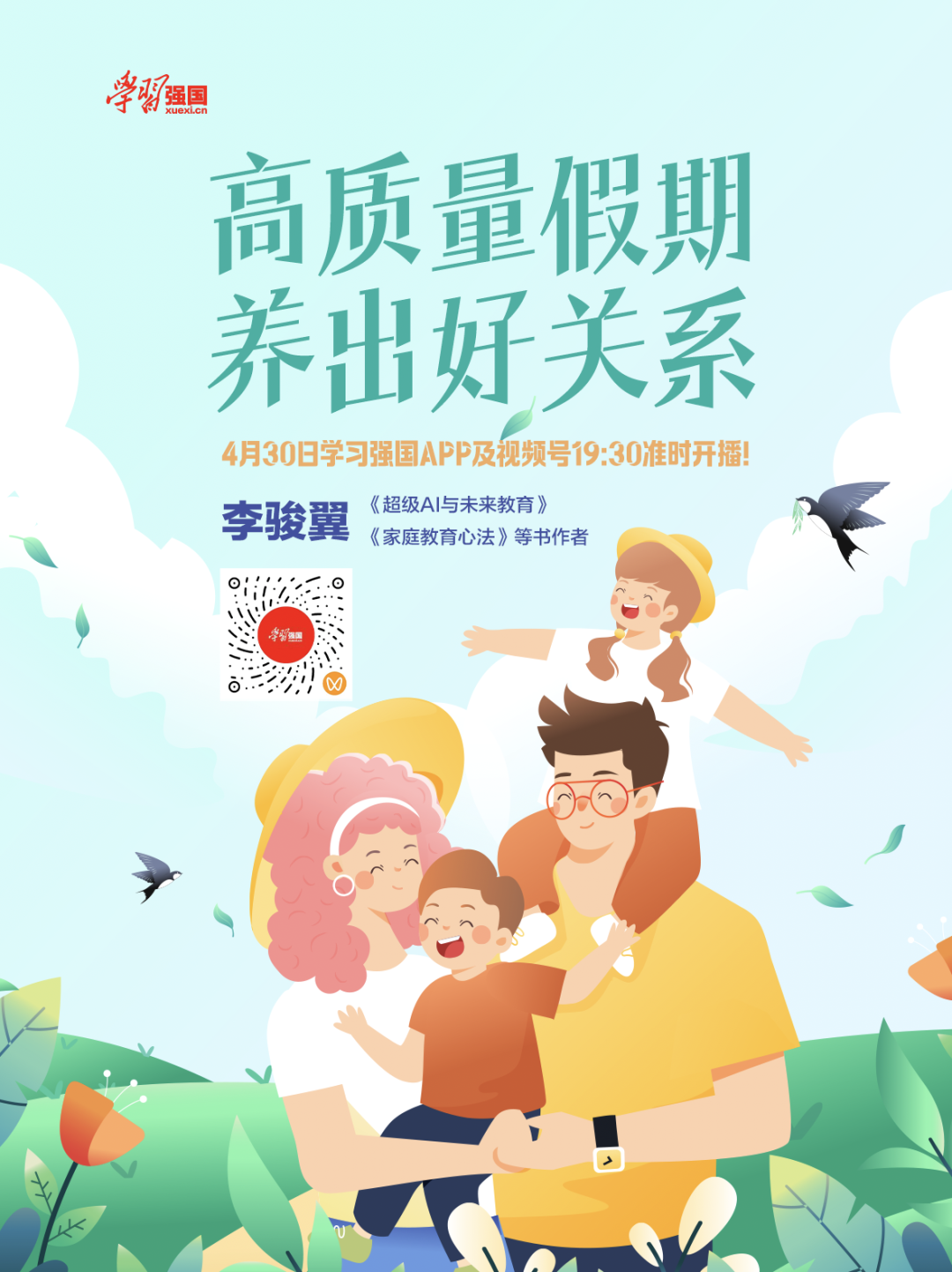 今天19:30,学习强国特邀《超级AI与未来教育》《家庭教育心法》作者李骏翼,与主播共话假期与关系相处之道。