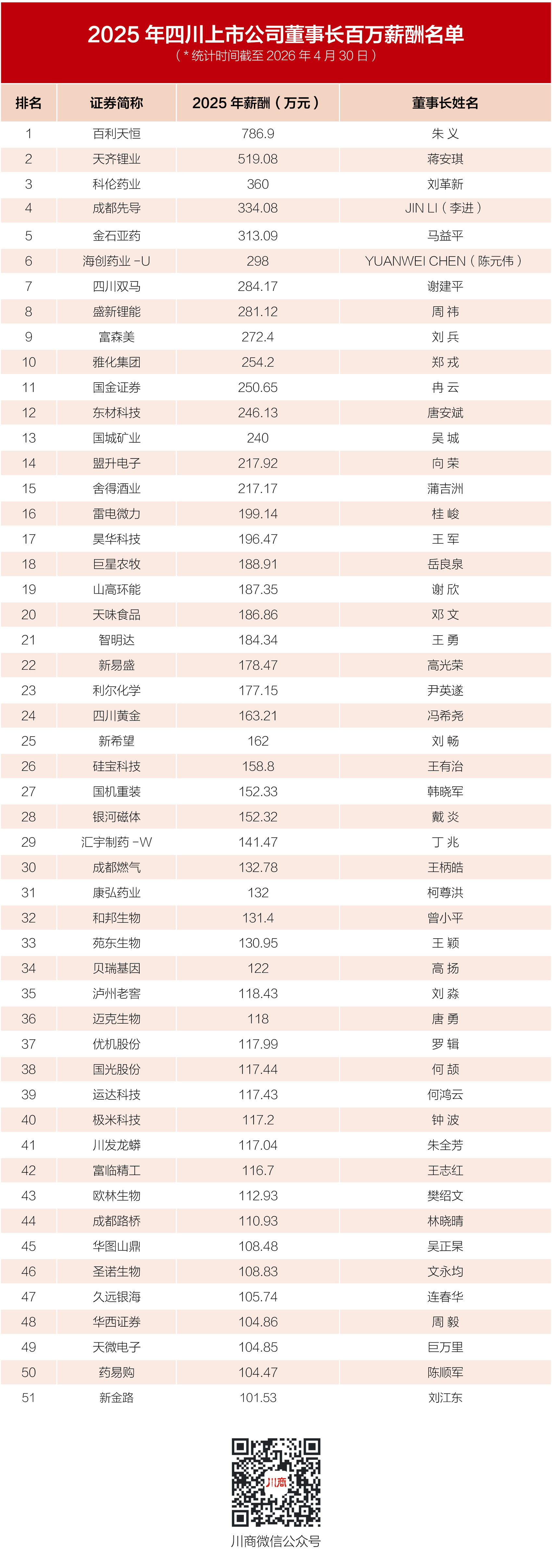 董事长薪酬的高低,短期看是个人回报,长期看或是产业价值的“风向标”。当百利天恒董事长朱义靠着“十年磨一剑”的重磅新药将薪酬推向近800万元时,我们看到的是四川医药健康产业从“仿制”到“创新”的历史跨越;当天齐锂业蒋安琪、东材科技唐安斌等掌舵人集体站上舞台中央时,其背后是四川得天独厚的资源禀赋予“十五五”时期政策红利的双重加持。唯有锚定科技创新与产业升级,才能真正拥抱高价值未来。