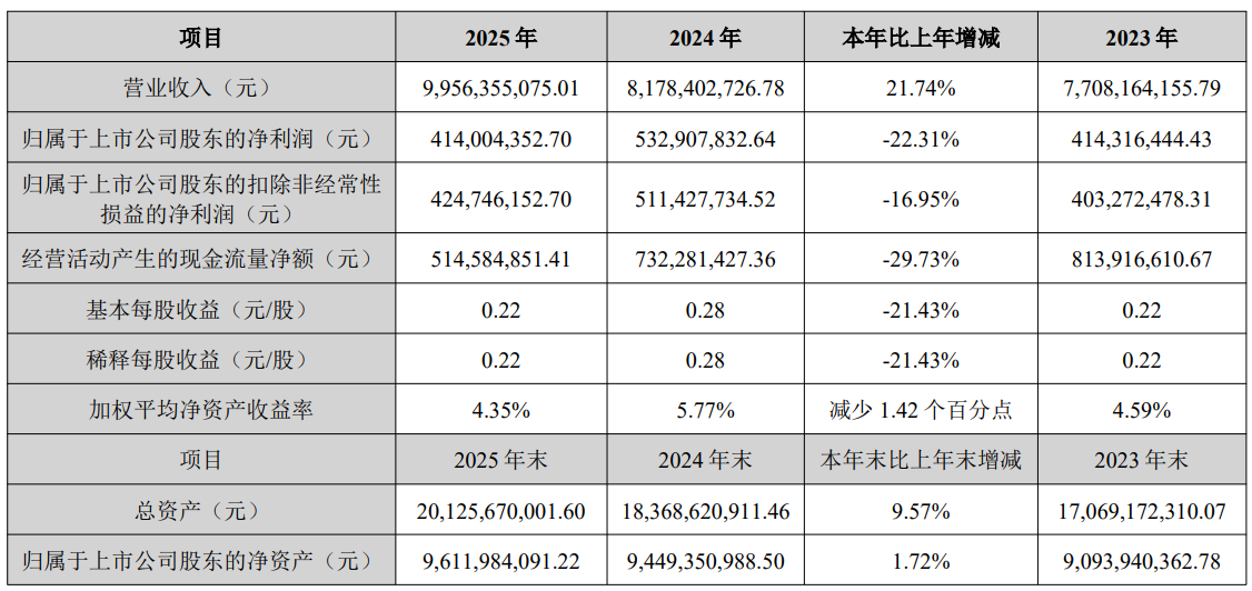 2025年,公司实现营业收入99.56亿元,同比增长21.74%;归属于上市公司股东的净利润4.14亿元,同比下降22.31%;归属于上市公司股东的扣除非经常性损益的净利润4.25亿元,同比下降16.95%。截至2025年末,公司总资产201.26亿元,较年初增长9.57%,归属于上市公司股东的净资产96.12亿元,较年初增长1.72%。