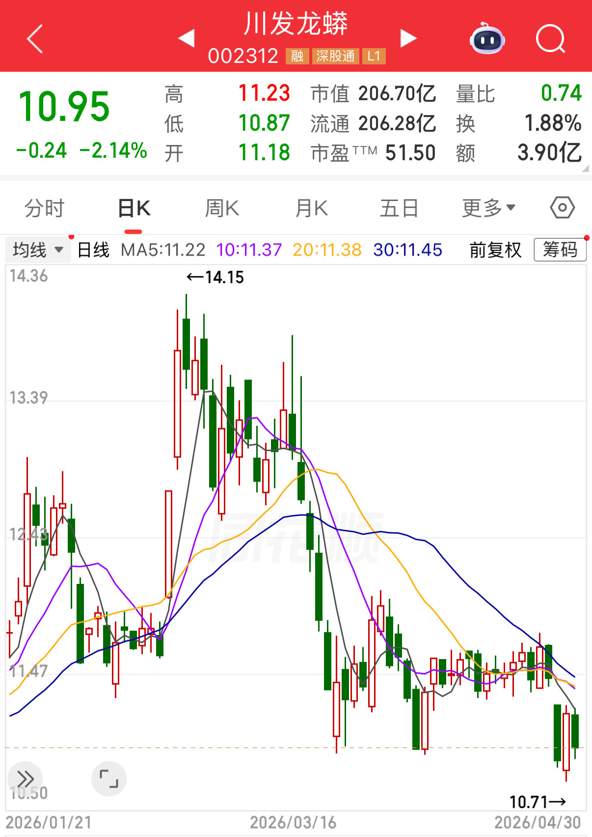 二级市场方面,截至4月30日收盘,川发龙蟒报10.95元/股,总市值206.70亿元。