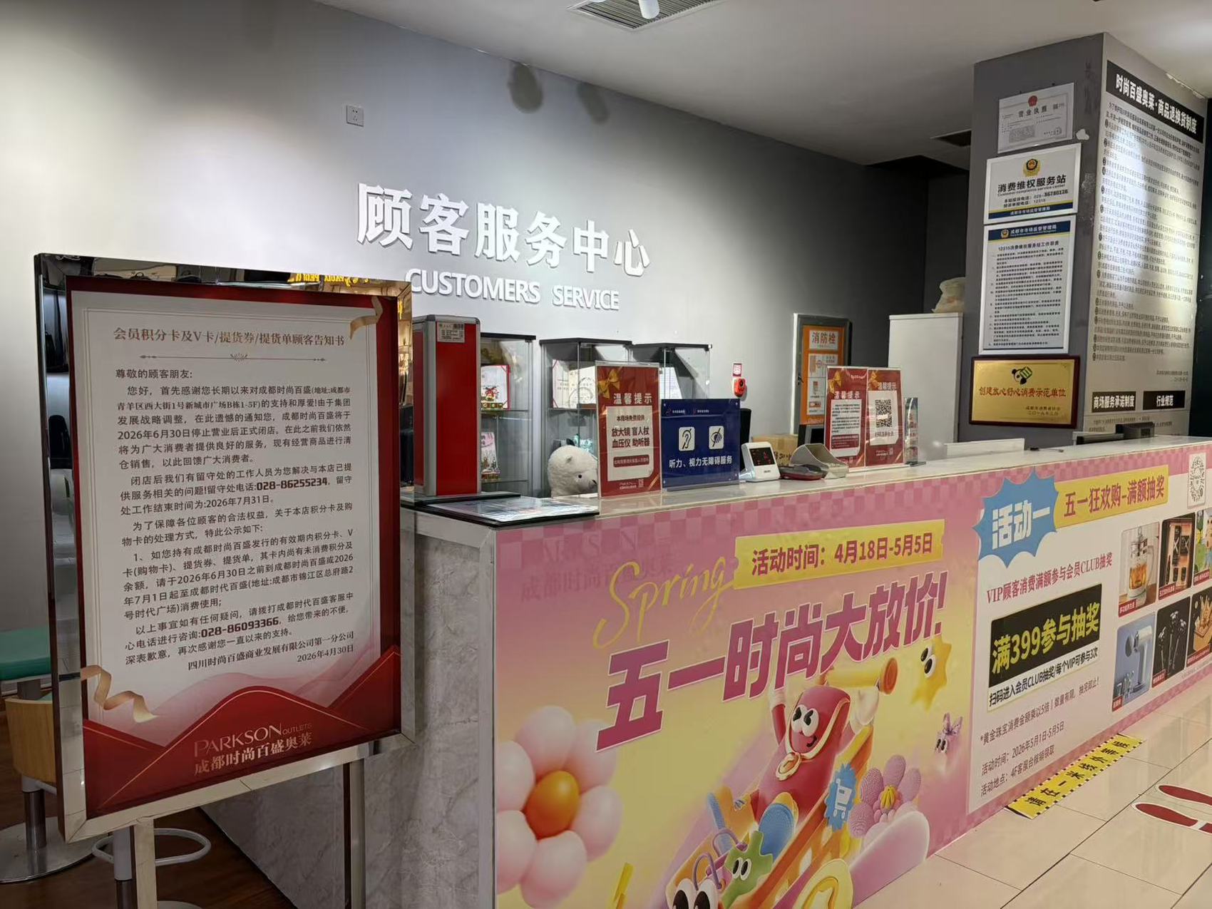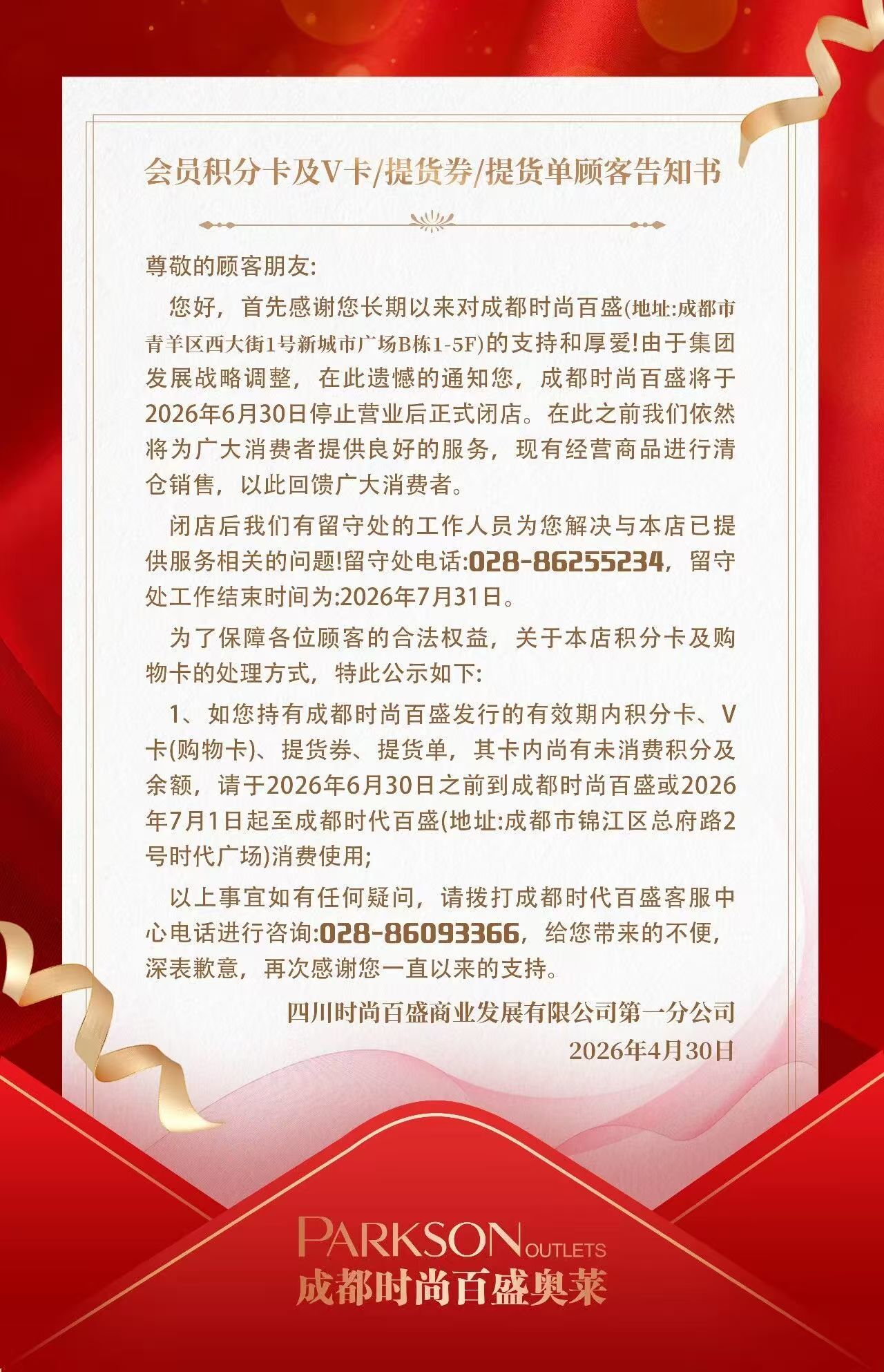 同时发布的告顾客通知书显示,闭店后商场将设立留守处至2026年7月31日,专门处理售后及卡券问题,所有未使用的积分卡、V卡、提货券等可在6月30日前在该店使用,7月1日起将全部转移至锦江区总府路的成都时代百盛继续使用。
