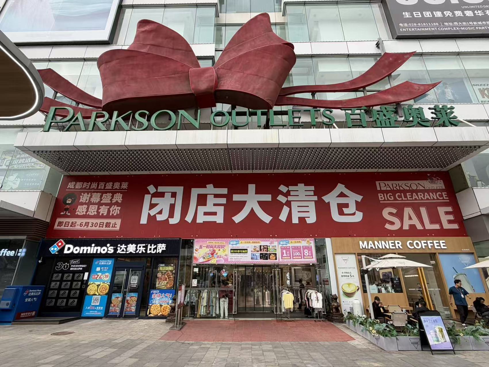 当天上午,记者前往成都时尚百盛奥莱现场,只见商场入口上方标志性的红色巨型蝴蝶结下,写着“闭店大清仓”的红色横幅颇为醒目,不时有市民走进商场。
