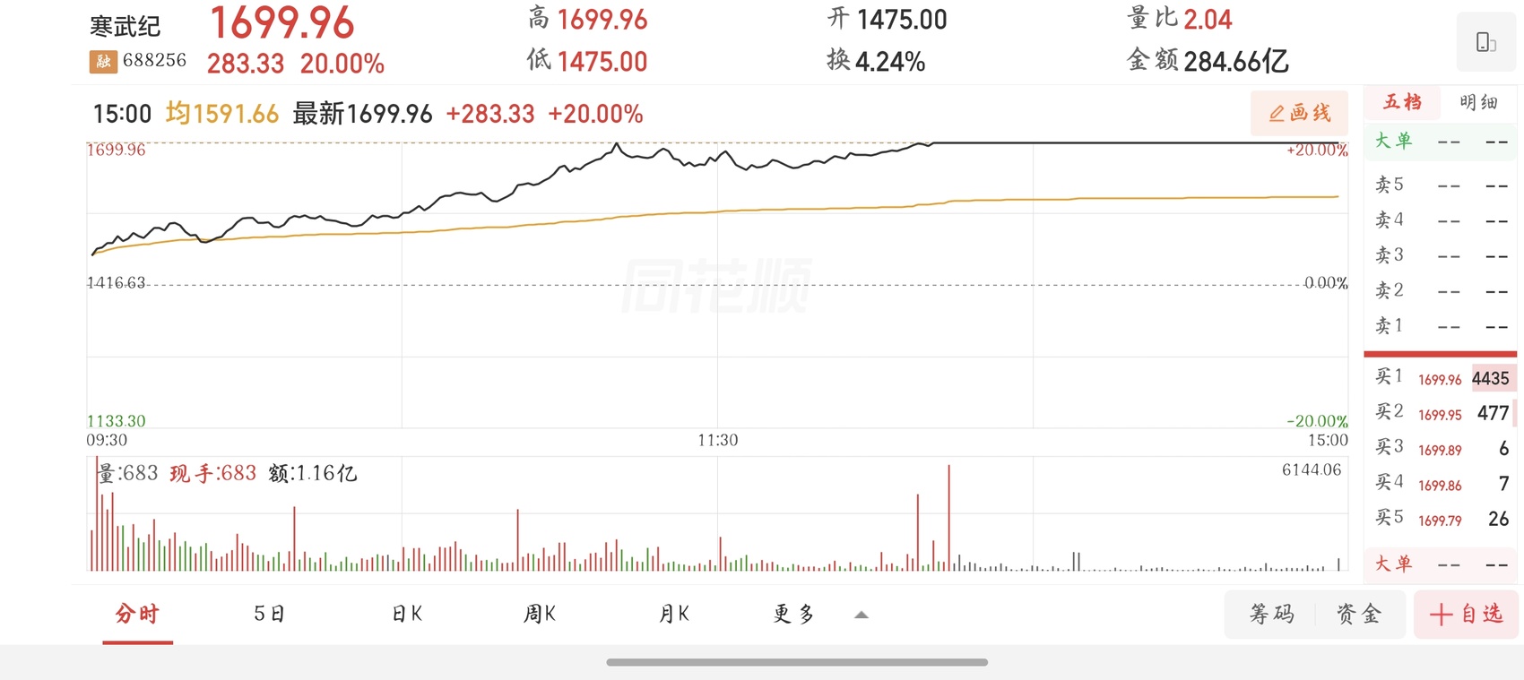 科创板逆市飙涨,归功于“带头大哥”寒武纪——股民口中的“寒王”。该股午后封死20%涨停,时隔8个月再度刷新历史高点,股价逼近1700元,总市值突破7100亿元,与源杰科技展开激烈角逐,最终重登A股“股王”宝座。两大科技股双双超越贵州茅台,这也就说明——AI的故事,还有得讲。