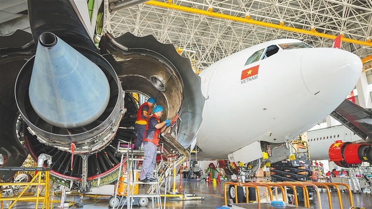 海南自贸港一站式飞机维修产业基地机库,机务维修人员对飞机进行检修。海南日报全媒体记者 张茂 摄