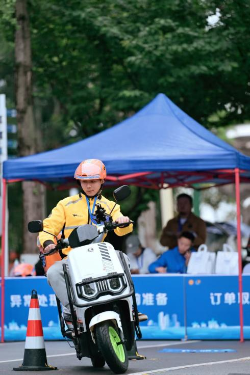 “S弯道通过时车身要正,压线、脚触地都扣分!”“配送箱必须平稳,模拟餐品不能洒!”裁判的指令清晰。在狭窄的锥桶通道中,选手们操控着电动车灵巧穿行,既要速度,更要稳定。这项名为“车辆规范操控与高效配送”的实操项目,模拟了配送中最常见的复杂路况,直接考验着骑手们的基本功。