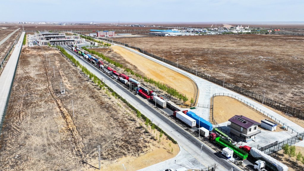 4月30日,二连浩特公路口岸货运车辆有序排队通关(无人机照片)。