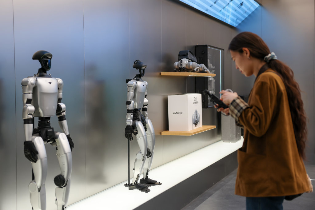 4月30日,在宇树科技全国首家直营店,参观者在拍摄展示的人形机器人。