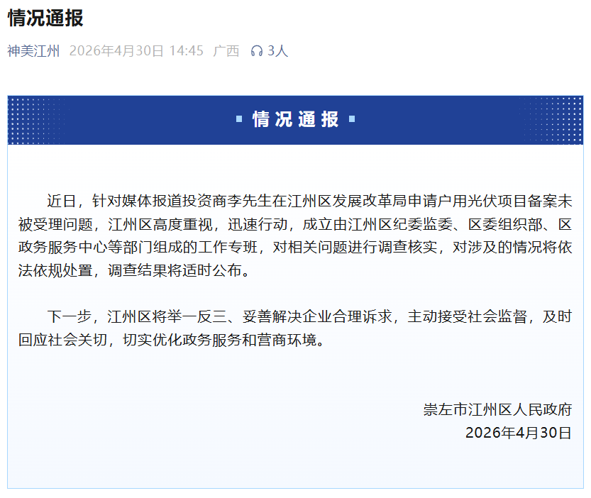 近日,针对媒体报道投资商李先生在江州区发展改革局申请户用光伏项目备案未被受理问题,江州区高度重视,迅速行动,成立由江州区纪委监委、区委组织部、区政务服务中心等部门组成的工作专班,对相关问题进行调查核实,对涉及的情况将依法依规处置,调查结果将适时公布。