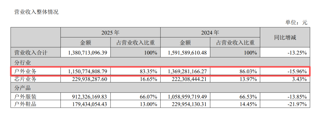 财报业绩的下滑,主要源于其核心户外业务板块的疲软。报告期内,占总营收超过八成的户外业务实现收入11.51亿元,同比下降15.96%。这一下滑与线下渠道的调整和收缩密切相关,加盟、直营和联营三大线下渠道收入均出现不同程度的下滑。