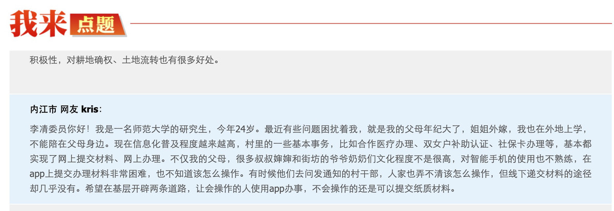 内江网友kris是一名24岁的师范大学研究生,最近却面临一些困扰,不是学业或就业,而是远在农村老家的父母——随着信息化普及程度越来越高,合作医疗办理、社保卡办理等农村基本事务几乎都实现了网上或APP办理。但父母以及家里亲戚、街坊文化程度不高,使用智能手机不熟练,不知如何操作办理业务。
