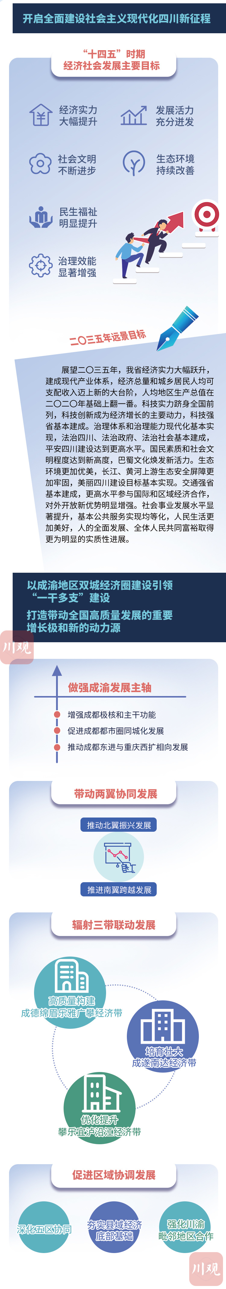 《纲要草案》从经济实力、发展活力、社会文明、生态环境、民生福祉、治理效能六个方面,明确了今后五年四川经济社会发展的主要目标,描绘了四川2035年的远景目标。