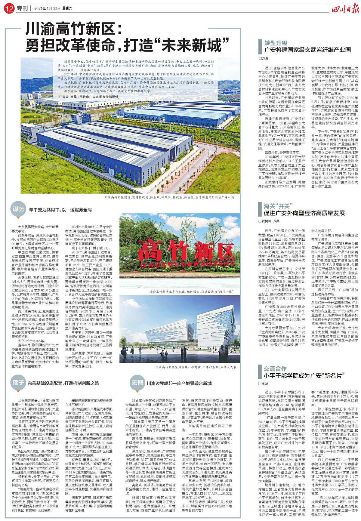 第一个跨省域发展的新区——川渝高竹新区如何建?广安海关开关一个多月来交出了一份怎样的成绩单?广安玄武岩纤维产业发展有何进展?1月30日出版的四川日报,以整版篇幅关注广安多件大事,为广安发展鼓劲加油。
