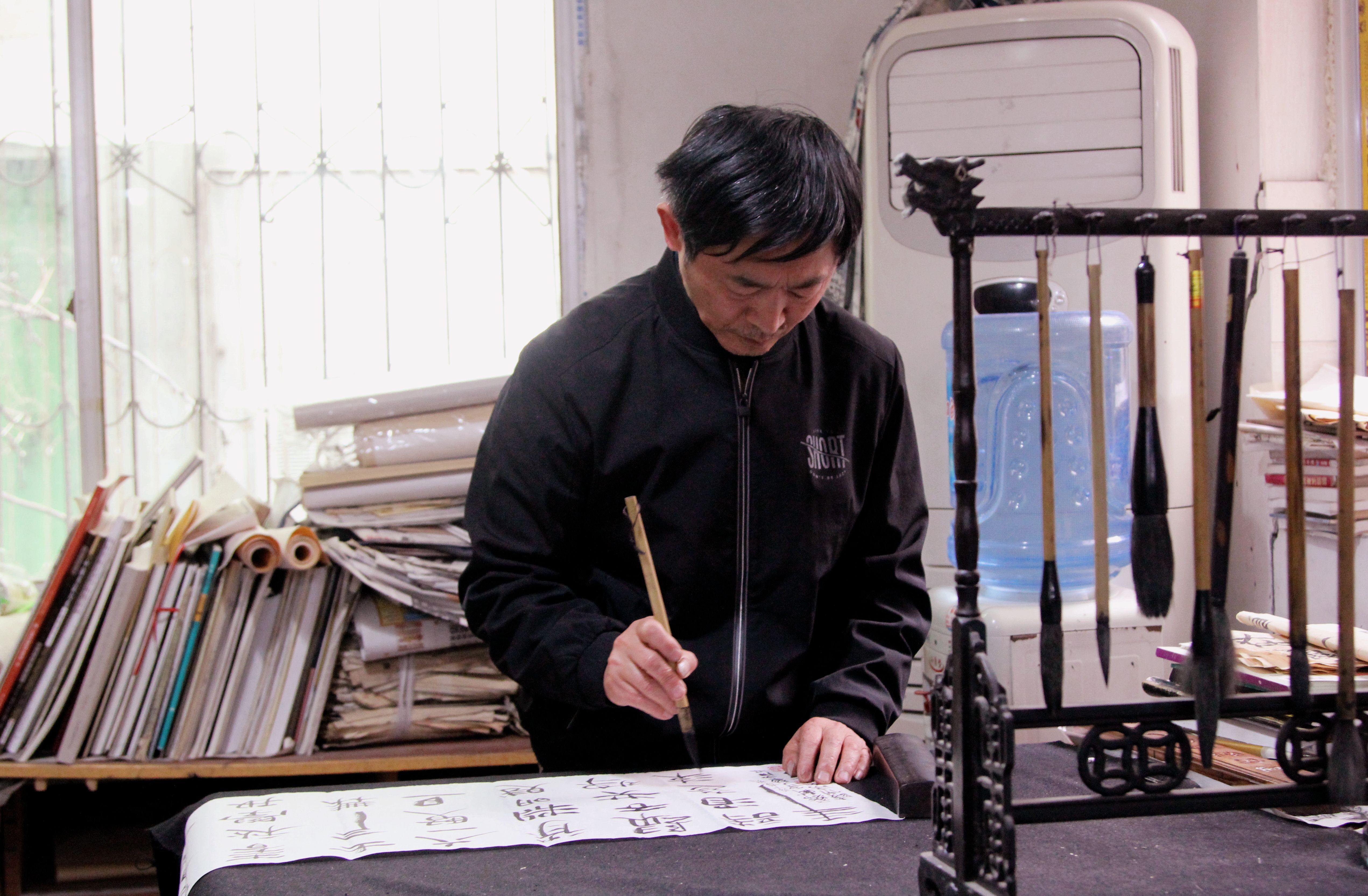“那时候花9分钱买的红纸可以写两幅对联,而每幅对联能卖两毛。”尝到书法甜头的他经济明显好转,从此天天在周边几个乡镇赶转转场,乐此不疲。先全是自己写,后兼顾卖挂联,最多一场要卖上好几百幅。