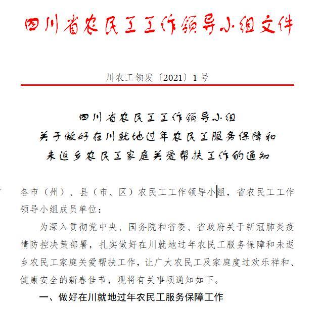 在川就地过年农民工服务咋保障? 2月1日,记者从省农民工工作领导小组获悉,四川省农民工工作领导小组近日出台《关于做好在川就地过年农民工服务保障和未返乡农民工家庭关爱帮扶工作的通知》(以下简称《通知》)。